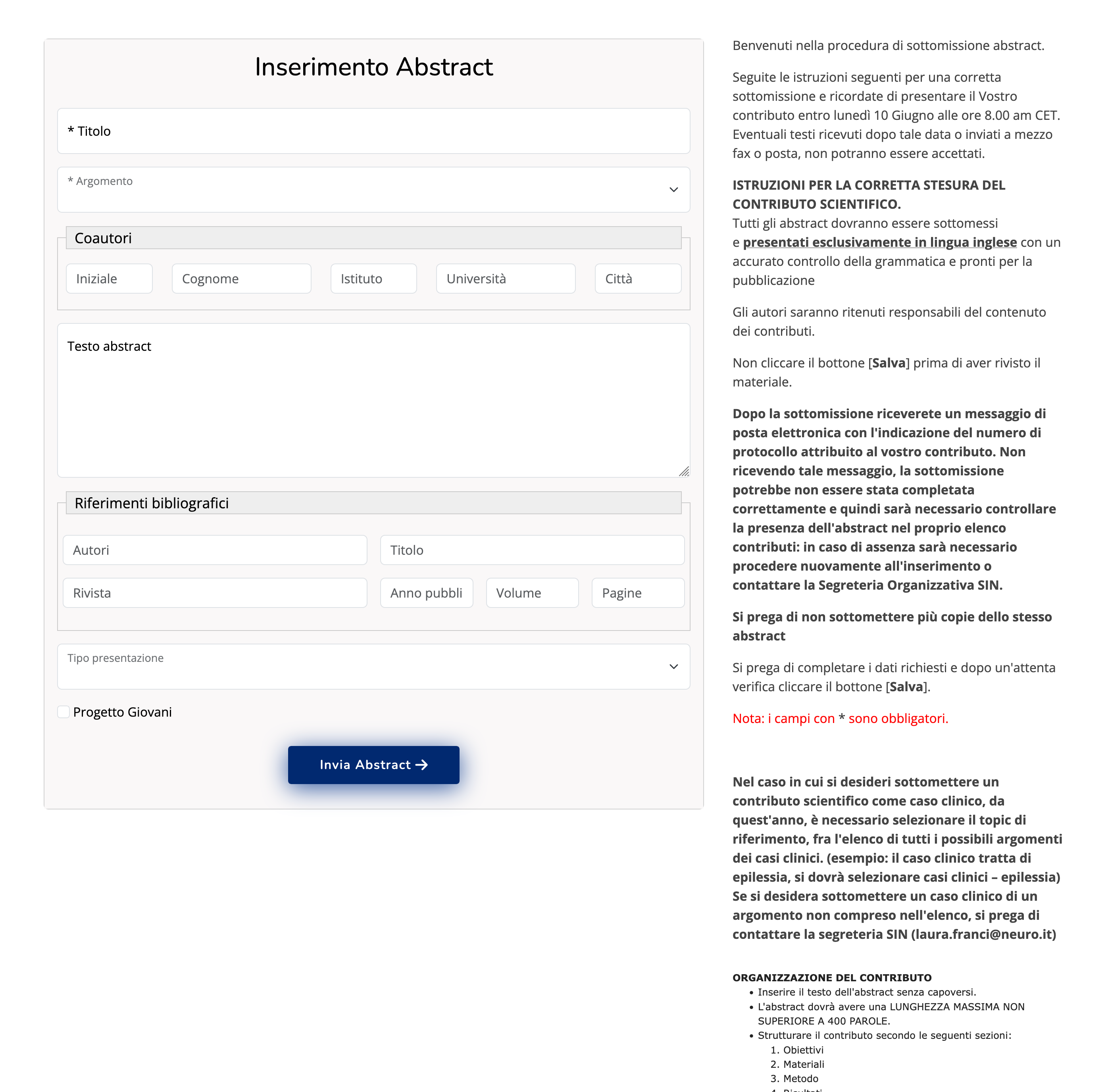 Ottimizza la gestione degli abstract del tuo congresso con la nostra piattaforma intuitiva. Semplifica la presentazione e la valutazione dei lavori, offrendo agli autori un'esperienza fluida e alla commissione scientifica strumenti efficienti. Personalizza i moduli di presentazione per adattarli perfettamente alle esigenze specifiche del tuo evento